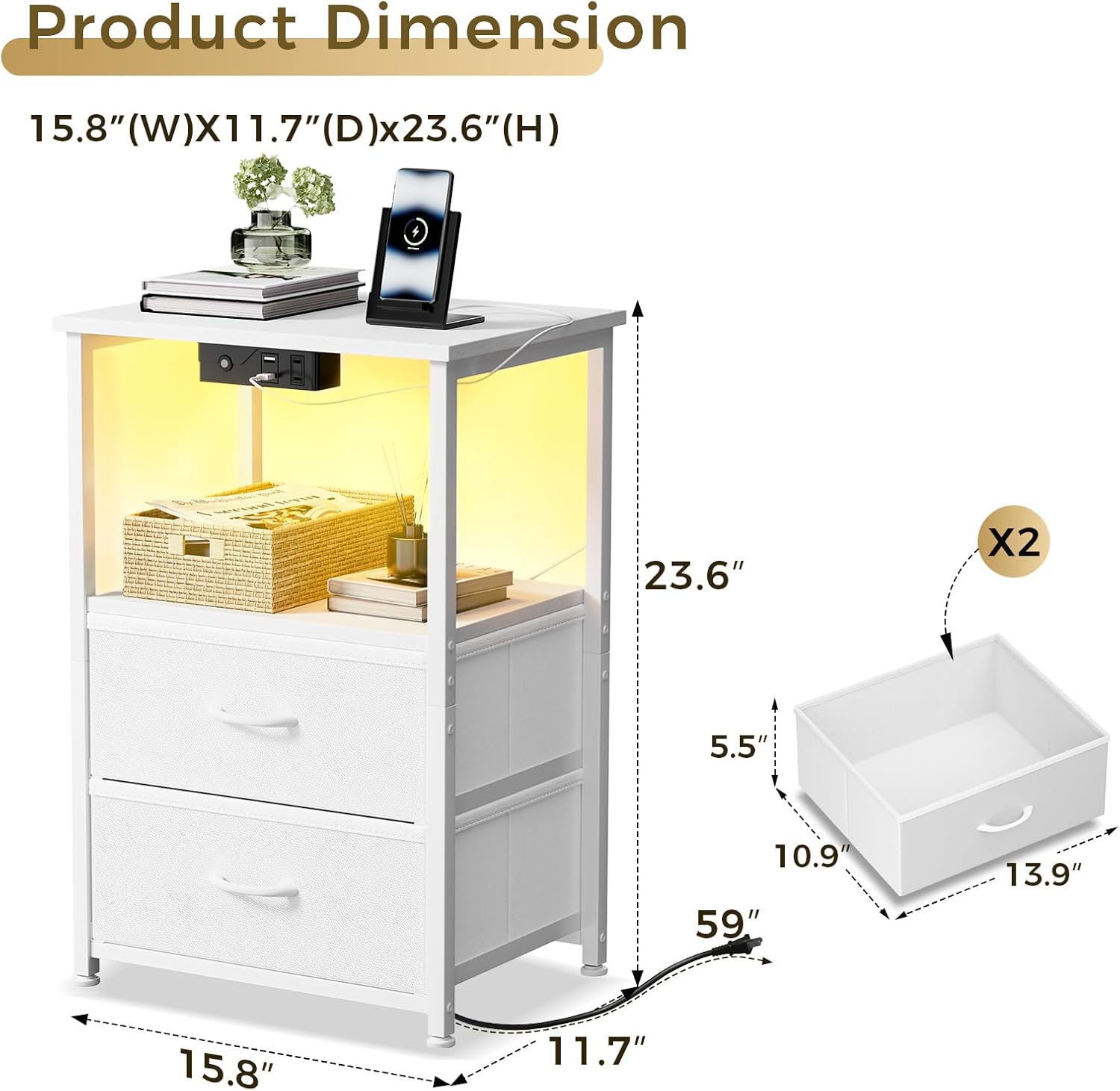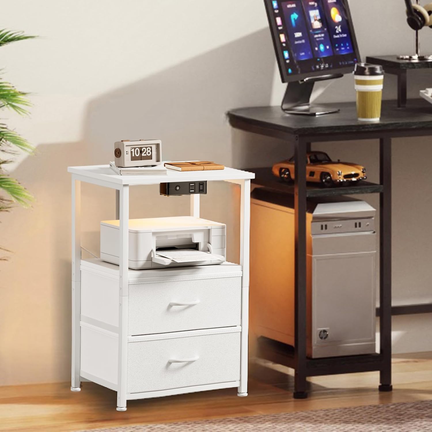 Nightstand with Charging Station and LED Lights, Small Night Stand for Bedroom with Fabric Drawer and Storage Shelf, End Table with Waterproof Top, Easy Assembly, White